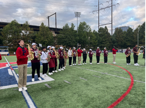 After wrapping up the final rehearsal before the performance, the Harrison Band followed swiftly behind the Penn Band members to march their way down to the historic Franklin Field, where the football game was about to begin. One of the most exciting aspects of this experience was that the Harrison Band had the incredible opportunity to perform the Star Spangled-Banner for the entire stadium on their own in the middle of the field. After this once-in-a-lifetime-opportunity, the Harrison students followed the Penn Band up to the bleachers to play iconic stand-tunes during the first two quarters of the game. After the UPenn football team scored two touchdowns, the energy and excitement had reached a new maximum. Then came the time for the moment that the marching band had been waiting for: the halftime show.